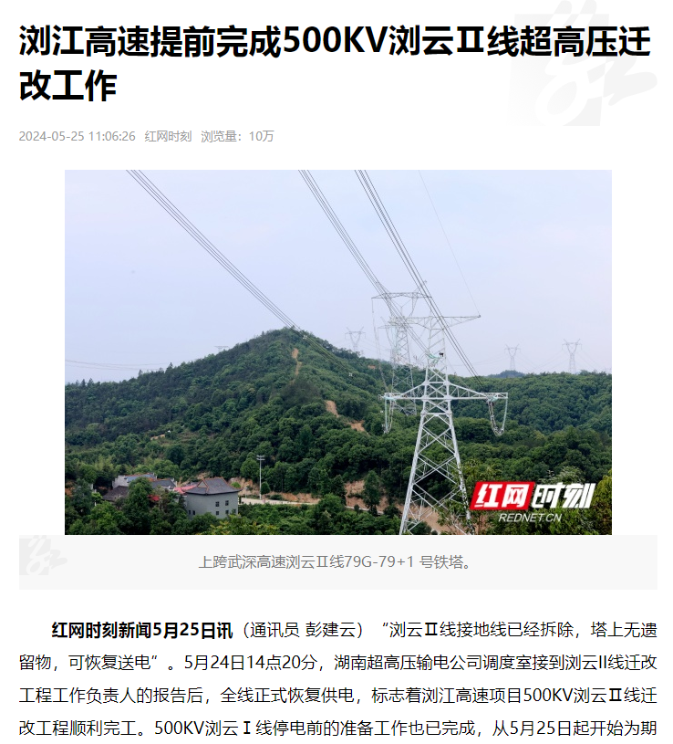 湖南建投茶江高速浏江段提前完成500KV浏云Ⅱ线超高压迁改工作